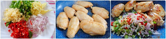 Bước 2: Bắc một chiếc chảo không dính lên bếp, cho chút dầu ăn vào, chờ dầu hơi nóng cho cánh gà đã ướp ngấm gia vị vào chiên với lửa thấp. Chiên cho cánh gà vàng hai mặt, và chín đều.