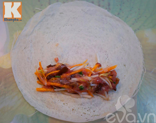 4: Đặt bánh đa nem/bánh tráng lên mặt thớt sạch rồi dùng thìa/muỗng xúc nhân nem rán trải đều, sau đó gập 2 đầu rồi cuộn tròn lại thật chắc tay để nem không bị quá lỏng -> rời rạc và nhũn khi thành phẩm. Làm thế đến khi hết nguyên liệu thì thôi.
