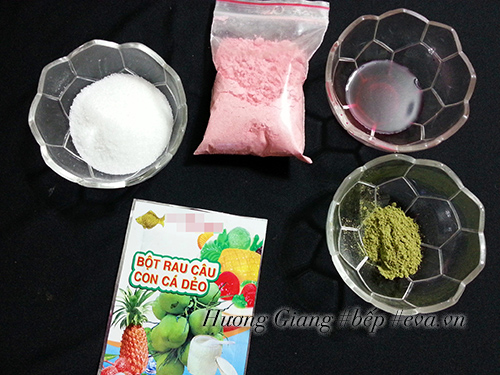B1: Bột trà xanh cho vào bát con (chén ăn cơm) cùng chút xíu nước sôi, hòa tan. Bột dâu tây cũng cho vào bát cùng chút nước hòa tan. Ngoài ra các chị em có hể sử dụng nước ép hoa quả hoặc màu thực phẩm + mùi tương ứng tùy theo ý thích.B2: Cho đường và bột rau câu chung 1 tô rồi trộn đều lên, cho nước vào nồi đun sôi. Sau đó đổ từ từ đường bột rau câu vào vừa khuấy làm sao cho bột rau câu hòa tan không bị vón cục lại Nấu vài phút cho rau câu nhìn trong lại thì tắt bếp.