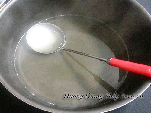 B2: Cho đường và bột rau câu chung 1 tô rồi trộn đều lên, cho nước vào nồi đun sôi. Sau đó đổ từ từ đường bột rau câu vào vừa khuấy làm sao cho bột rau câu hòa tan không bị vón cục lại Nấu vài phút cho rau câu nhìn trong lại thì tắt bếp.