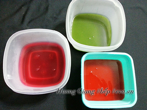 B3: Chia đều phần nước rau câu vừa nấu được ra 3 bát đều nhau, sau đó chúng ta các màu đã pha sẵn (ở bước 1) vào khuấy đều lên.